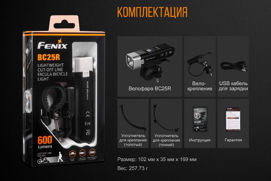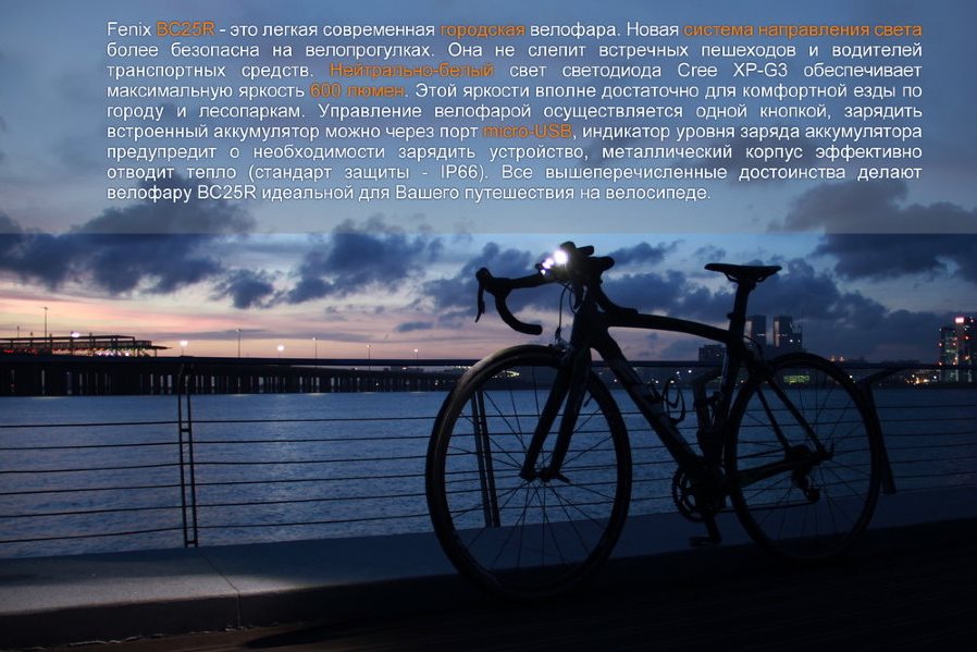 Модель Fenix BC25R разработана для велосипедистов. Это современный яркий фонарь с креплением на руль. Он предлагает до 600 люмен яркости при дальности освещения до 106 метров. Велофара надежно защищена от попадания воды и пыли внутрь корпуса.